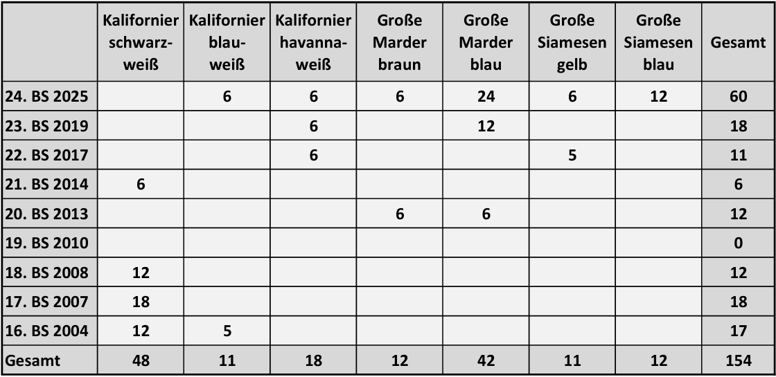 Statistik unserer ausgestellten Rassen 2004 bis 2019 Insgesamt wurden in den Jahren 2004 bis 20019 94 Tiere ausgestellt. Wobei mehr als 50% auf die Kalifornier in schwarz-weiß entfallen. Seit dem Jahr 2013 wurden auch Kalifornier in havanna-weiß, Große Marder in braun und blau sowie Große Siamesen in gelb gezeigt. Die Großen Siamesen in blau waren bis 2019 noch nie auf einer Bundesschau. Der Durchschnitt in den Jahren 2004 bis 2019 liegt bei 11,75 ausgestellte Tiere. Mit 76 von 94 ausgestellten Tieren wurden 81% vom K5 Völkermarkt ausgestellt.