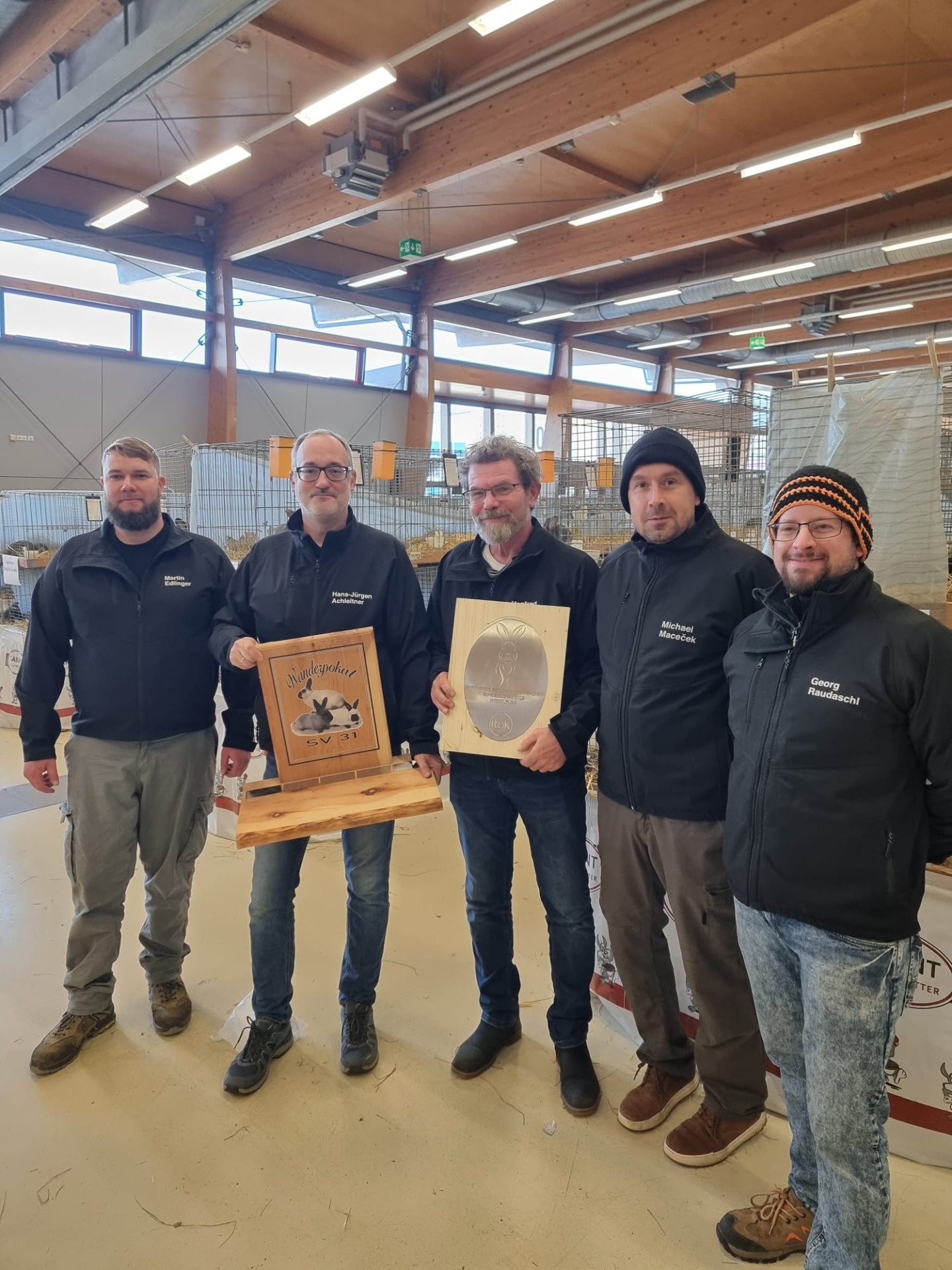 Manfred Warmuth, Leon Vrecar, Christian Hofmann, Gunter Anders, Georg Raudaschl und Hans-Jürgen Achleitner vertreten den SV31 bei der Fleischkaninchenschau in tschechischen Holice. Manfred, Leon, Christian und Gunter sind bereits seit vielen Jahren als Aussteller dabei. Für Jürgen ist es das dritte und für Georg das zwei Mal. Insgesamt stellen wir 42 Tiere der Rassen Große Marder blau und braun, Große Siamesen blau und gelb sowie Kalifornier in schwarz-weiß und blau-weiß aus.